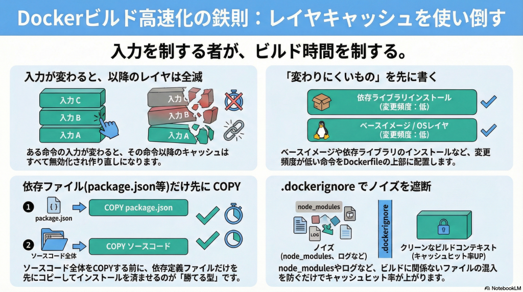 7-2. 効かせる最短手:Dockerfile順序+.dockerignore+外部依存RUN削減